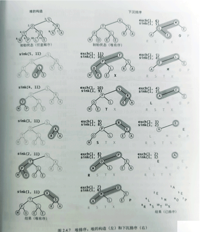 堆排序可以分为两个阶段。在堆的构造阶段中,我们将原始数组重新组织安排进一个堆中;然后在下沉排序阶段,我们从堆中按递减顺序取出所有元素并得到排序结果。为了和我们学过的代码保持一致,我们将使用一个面向最大元素的优先队列并重复删除最大元素。我们不再使将优先队列的具体表示隐藏,并将直接使用swim()和sink()操作。这样我们在排序时就可以将需要排序的数组本身作为堆,因此无需任何额外空间。