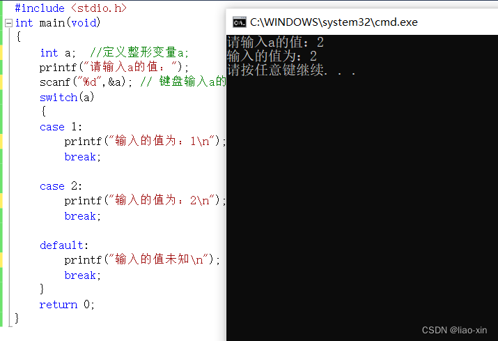 printf("输入的值为:2\n"); // a为2执行这条语句