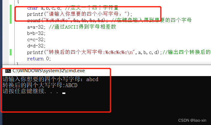 printf("转换后的四个大写字母:%c%c%c%c\n",a,b,c,d);//输出四个转换后的字母