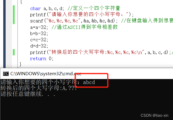 5、printf("转换后的四个大写字母:%c,%c,%c,%c\n",a,b,c,d); %c可以不用逗号隔开,影响不大,后面的abcd一定要用逗号隔开,因为它显示的a,b,c,d四个的字符变量,如果是abcd的话就是abcd这个一个字符变量,而且前面也没有定义abcd的字符变量。