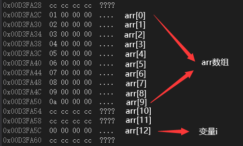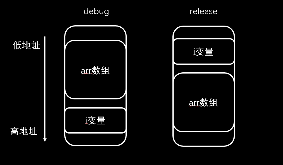 在debug配置下,储存i变量的地址比储存arr数组的地址高,可能会越界到i的地址导致死循环