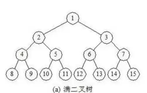 (1)满二叉树:在一颗二叉树中,如果所有分支结点都存在左子树和右子树,并且所有叶子都在同一层上,这样的二叉树称为满二叉树。如果一个二叉树的层数为K,且结点总数是(2^k) -1 ,则它就是满二叉树。