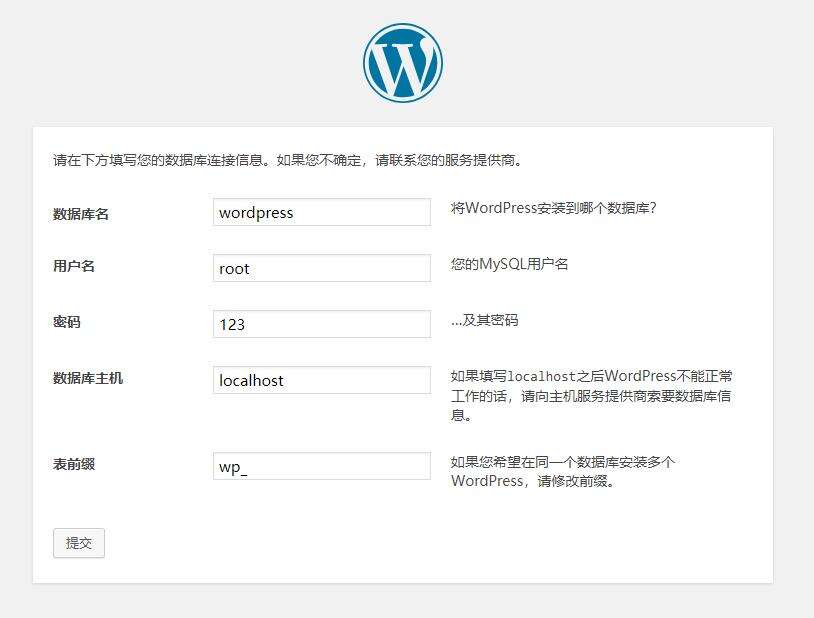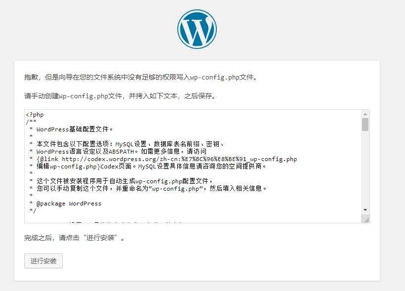 手动在/var/www/html/目录下创建wp-config.php文件,并将设置向导中的内容复制到wp-config.php文件中,随后点击立即安装即可。