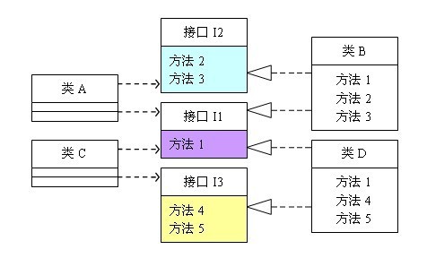 类A通过接口I依赖类B,类C通过接口I依赖类D,如果接口I对于类A和类B来说不是最小接口,则类B和类D必须去实现他们不需要的方法。