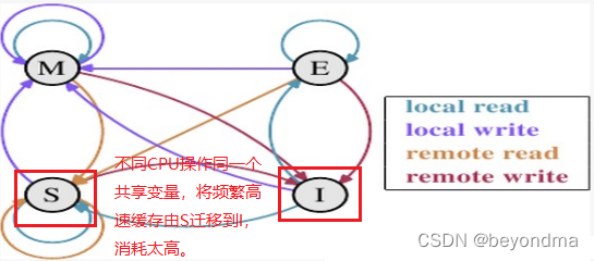 我们上文也提到了,不同的线程是有大概率是运行在不同CPU核上的,在不同CPU操作同一块内存时,站在CPU0的角度上看,就是CPU1会不断发起remote write的操作,这会使该高速缓存的状态总是会在S和I之间进行状态迁移,而一旦状态变为I将耗费比较多的时间进行状态同步。