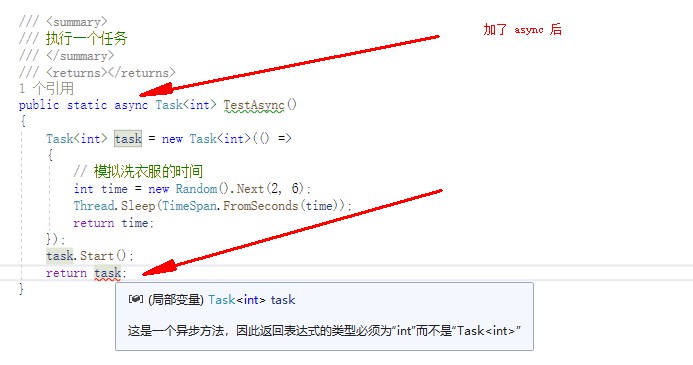 上面的示例,虽然说,异步完成了一个任务,但是这样,将代码都放到 Main ,可读性十分差,还要其它什么规范之类的,不允许我们写这样的垃圾代码。于是我们将洗衣服这个任务,封装到一个方法中,然后返回 Task 即可。