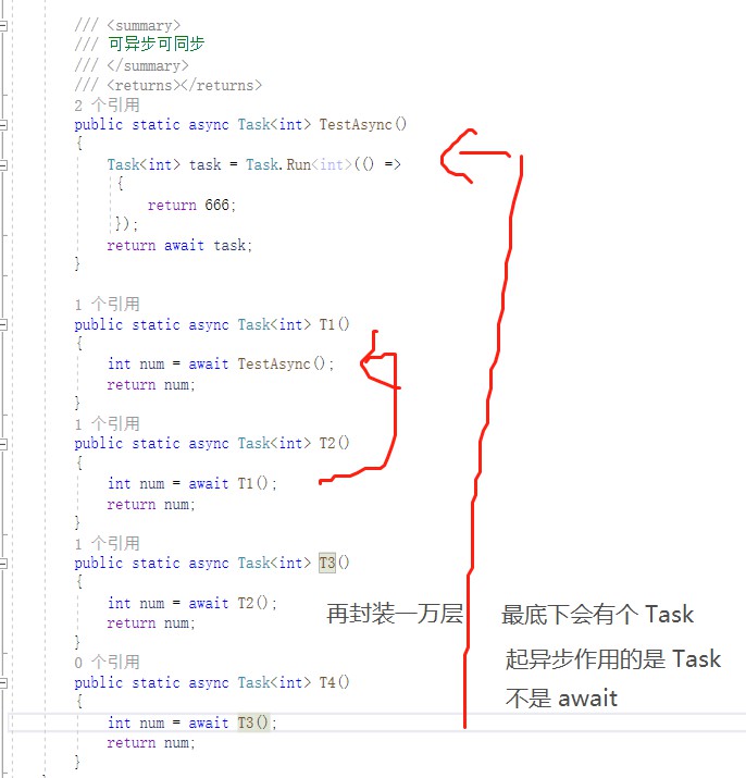 因为使用了 async 和 await 关键字,代码最深处,必定会出现 Task 这个东西,Task 这个东西本来就是异步。碰到 await 出现异步,不是因为 await 的作用,而是因为最底层有个 Task。