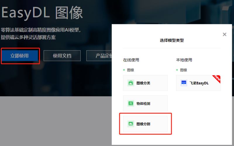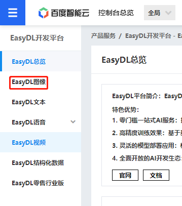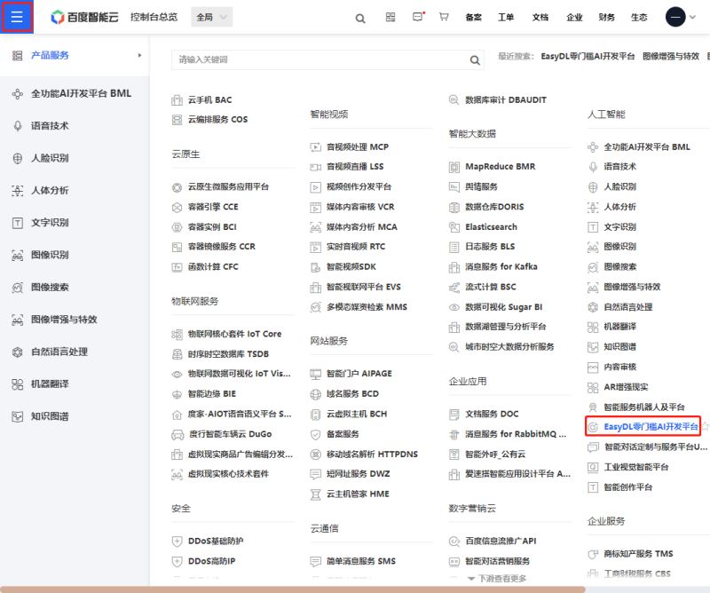 2.在左上角打开产品服务列表,找到EasyDL零门槛AI开放平台: