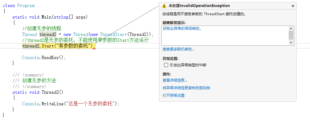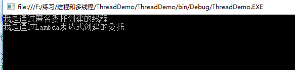 Thread thread2 = new Thread(() => Console.WriteLine("我是通过Lambda表达式创建的委托"));