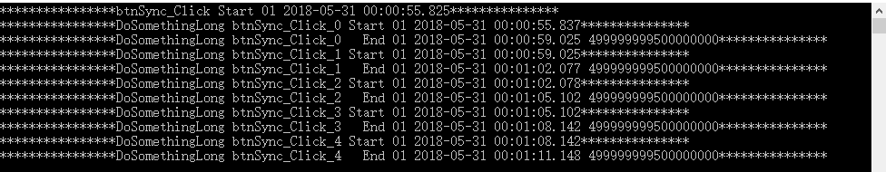 Console.WriteLine($"****************btnSync_Click Start {Thread.CurrentThread.ManagedThreadId.ToString("00")} {DateTime.Now.ToString("yyyy-MM-dd HH:mm:ss.fff")}***************");
