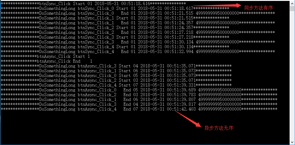 从截图中能够看出:同步方法执行是有序的,异步方法执行是无序的。异步方法无序包括启动无序和结束无序。启动无序是因为同一时刻向操作系统申请线程,操作系统收到申请以后,返回执行的顺序是无序的,所以启动是无序的。结束无序是因为虽然线程执行的是同样的操作,但是每个线程的耗时是不同的,所以结束的时候不一定是先启动的线程就先结束。从上面同步方法中可以清晰的看出:btnSync_Click_0执行时间耗时不到3秒,而btnSync_Click_1执行时间耗时超过了3秒。可以想象体育比赛中的跑步,每位运动员听到发令枪起跑的顺序不同,每位运动员花费的时间不同,最终到达终点的顺序也不同。