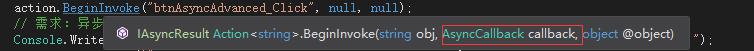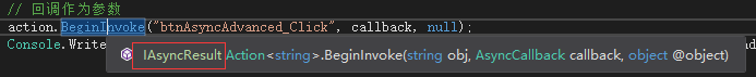 发现BeginInvoke的返回值就是IAsyncResult类型的。那么这个返回值是不是就是callback委托的参数呢?将代码进行如下的修改: