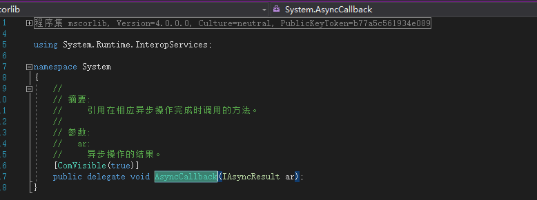 BeginInvoke的第二个参数就是一个回调,那么AsyncCallback究竟是什么呢?F12查看AsyncCallback的定义: