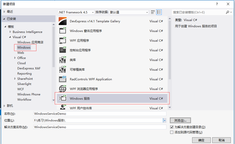 1、文件->新建->项目:选择Windows服务,修改项目名称和位置,然后点击"确定":