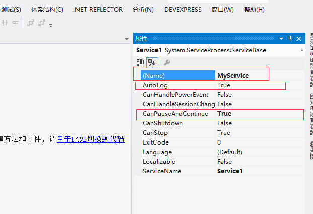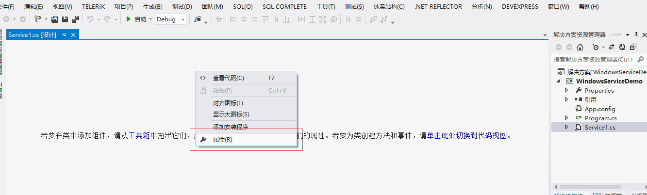 2、在默认生成的服务Service1设计界面上右键,选择“属性”,打开属性面板