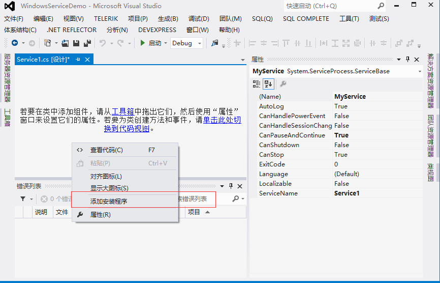 4、添加服务安装程序:在Service1的设计界面点右键,选择“添加安装程序”