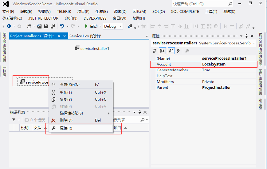 5.1 选中serviceProcessInstaller1点右键,选择“属性”,打开serviceProcessInstaller1的属性面板: