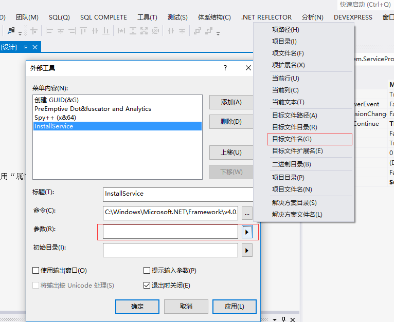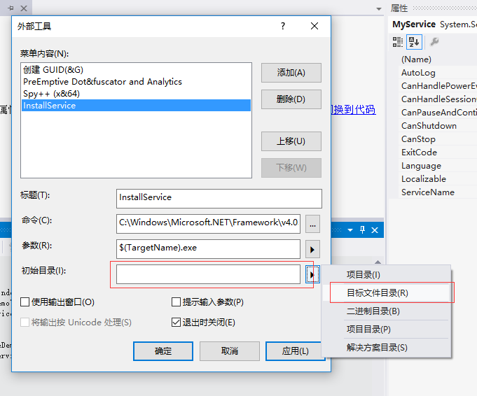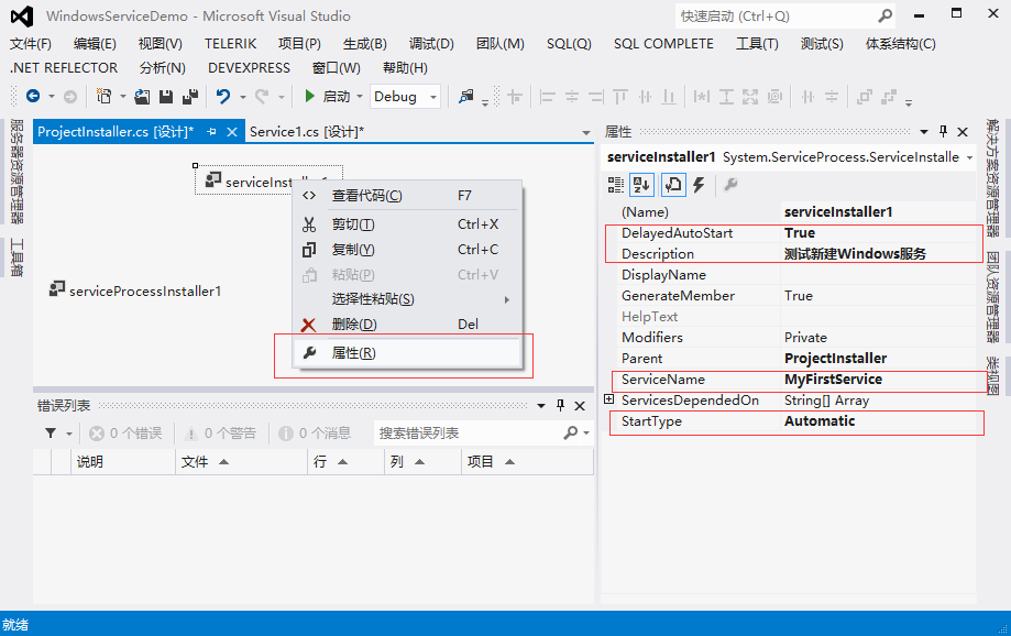 5.2 选中serviceInstaller1点右键,选择“属性”,打开serviceInstaller1的属性面板