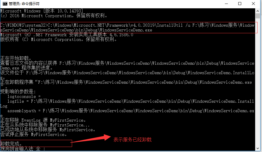 C:\Windows\Microsoft.NET\Framework\v4.0.30319\InstallUtil /u F:\练习\Windows服务\WindowsServiceDemo\WindowsServiceDemo\bin\Debug\WindowsServiceDemo.exe