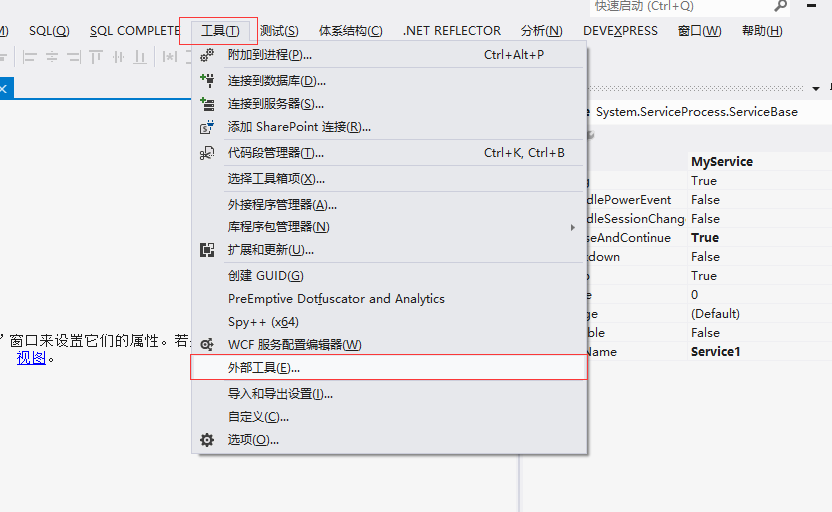 1、以管理员身份运行visual studio,打开解决方案,选择菜单栏的“工具”->"外部工具",打开外部工具界面: