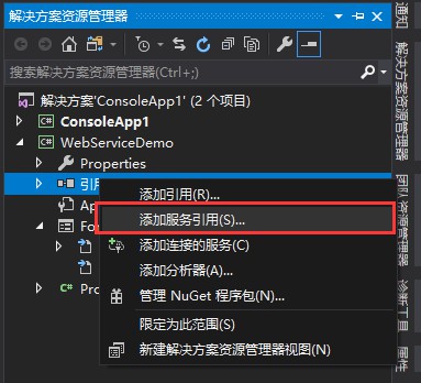 然后添加静态引用。在要调用WebService的项目上选择引用,然后右键选择“添加服务引用”,如下图所示: