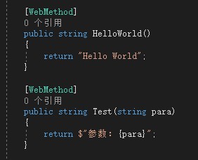 在日常工作中,如果涉及到与第三方进行接口对接,有的会使用WebService的方式,这篇文章主要讲解在.NET Framework中如何调用WebService。首先我们创建一个WebService,里面有两个方法:一个无参的方法,一个有参的方法: