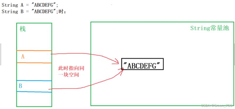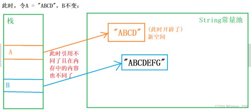 - 用字面量值创建String对象,例:String str = "ABCD";
