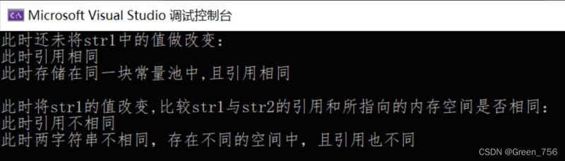 Console.WriteLine("此时将str1的值改变,比较str1与str2的引用和所指向的内存空间是否相同:");