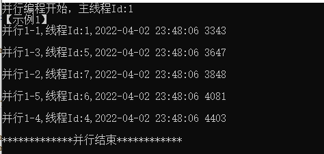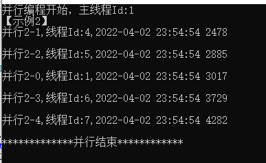 Console.WriteLine($"并行编程开始,主线程Id:{Thread.CurrentThread.ManagedThreadId}");