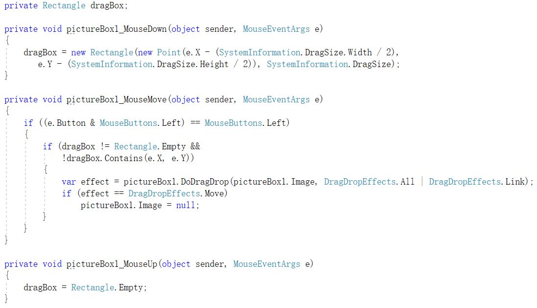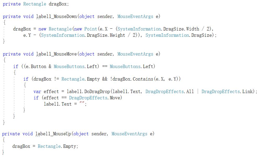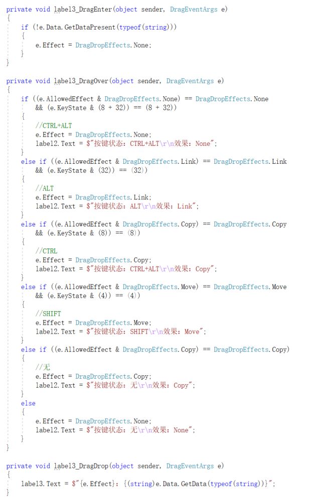 同时,还要实现DragEnter、DragDrop、DragDrop等事件,以在鼠标拖动数据到控件上后,根据按钮状态,设置不同的效果,并对拖动的数据,进行进一步处理。