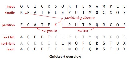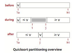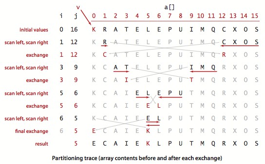 }该算法的关键在于切分 ,在Sort(IComparable[] a, int lo, int hi) 方法中,切分后 a[lo] 到 a[j-1] 中的所有元素都不大于 a[ j ] ,a[j+1] 到 a[ hi ] 中的所有元素都不小于 a[ j ] ,然后对左子数组和右子数组进行递归。因为切分的过程总能排定一个元素,当切分到剩一个元素时,子数组就是有序的。当左数组和右数组都有序时,整个数组也就有序了。