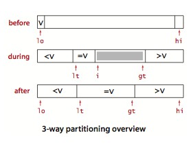 - a[i]小于v:与 a[i] 交换 a[lt] 并增加lt 和i