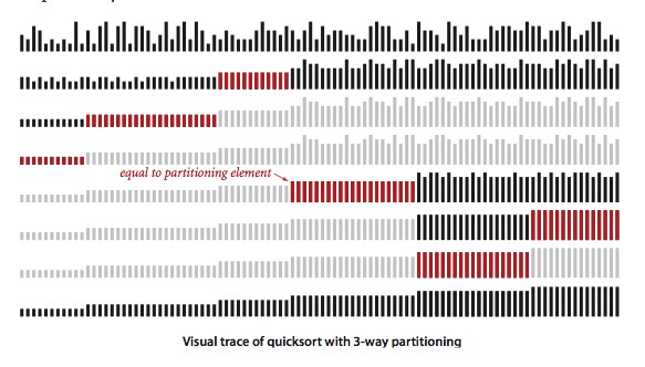 实际应用中经常会出现大量重复元素的数组,这会影响快排的性能。例如,一个全部重复的子数组就不需要排序了,但上面的算法会继续切分。三向切分的快速排序可以将有大量重复元素的数组从线性对数级别提高到线性级别。