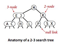 一棵完美平衡的 2-3 查找树中的所有空连接到根结点的距离都应该事相同的。简洁起见,这里用 2-3 树指代一棵完美平衡的 2-3 查找树(在其他情况下这个次表示一种更一般的结构)。