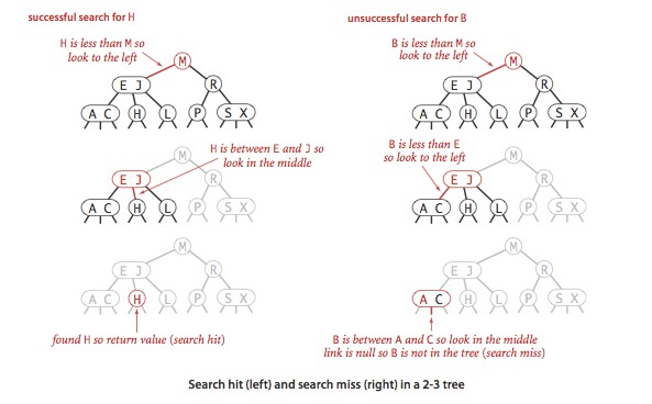 将二叉查找树的查找算法一般化就能直接得到 2-3 树的查找算法。要判断一个键是否存在树中,先将它和根结点中的键比较。如果它和其中任意一个键相等,查找命中;否则就根据比较的结果找到指向相应区间的链接,并在其指向的子树中递归地继续查找。