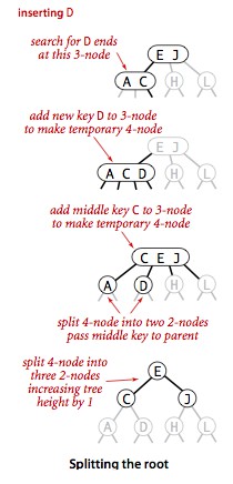 如果从插入结点到根结点都是 3- 结点,根结点最终变成一个临时的 4- 结点。此时按照向一棵只有一个 3- 结点的树中插入新键的方法,将临时 4- 结点分解成3个 2- 结点,使得树高加1。