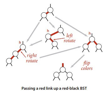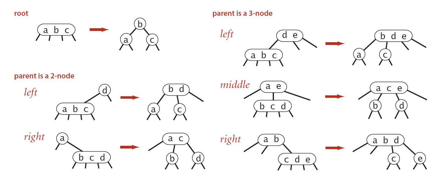 对于这种情况,前面的三种情况都会出现:可能是 3- 结点的右链接(只需要转换颜色),或是左链接(需要右转然后转换颜色),或是中链接(需要左旋转下层链接然后右旋转上层链接,最后变换颜色)。颜色转换会使中间结点变红。