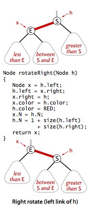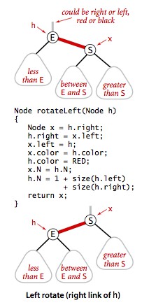 在我们实现的某些操作中可能会出现红色右链接或者两条连续的红链接,但在操作完成前这些情况都会被小心地旋转并修复。旋转操作会改变红链接的指向。