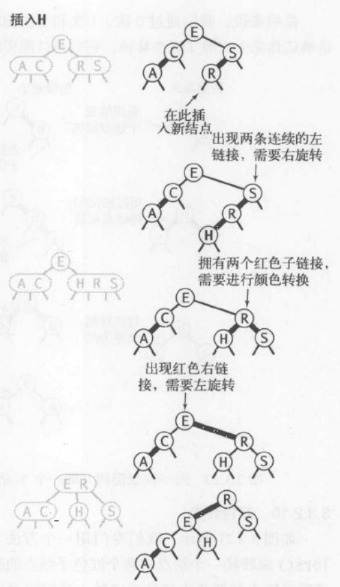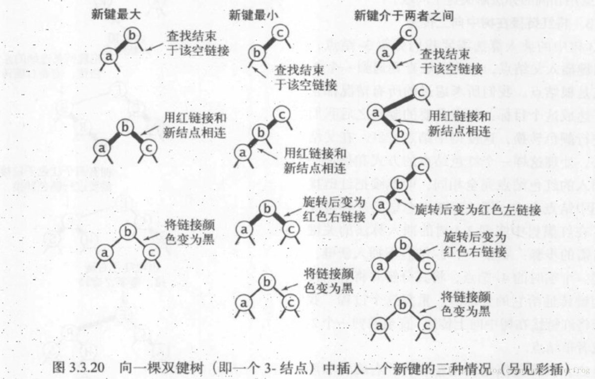这种情况分为三种情况:新键小于树中的两个键,两者之间,或是大于树中的两个键。每种情况都会产生一个同时连接两条红链接的结点,而我们的目的就是修正这一点: