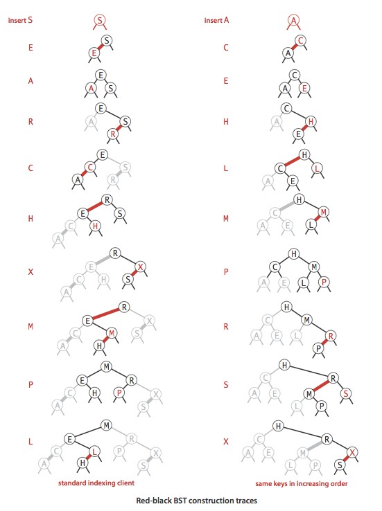 如果我们将一棵红黑树中的红链接画平,那么所有的空链接到根结点的距离都是相同的。如果将有红链接相连的结点合并,得到的就是一棵 2-3 树。相反,如果将一棵 2-3 树中的 3- 结点画作由红色链接相连的两个 2- 结点,那么不会存在能够和两条红链接相连的结点,且树必然是完美黑色平衡的,因为黑链接即 2-3 树中的普通链接,根据定义这些链接必然是完美平衡的。无论我们用那种方式取定义它们,红黑树都既是二叉查找树,也是 2-3 树。因此如果我们能够在保持一一对应关系的基础上实现 2-3 树的插入算法,那么我们就能将两个算法的优点结合起来:二叉查找树中高效简洁的查找方法和 2-3 树中高效的平衡插入算法。