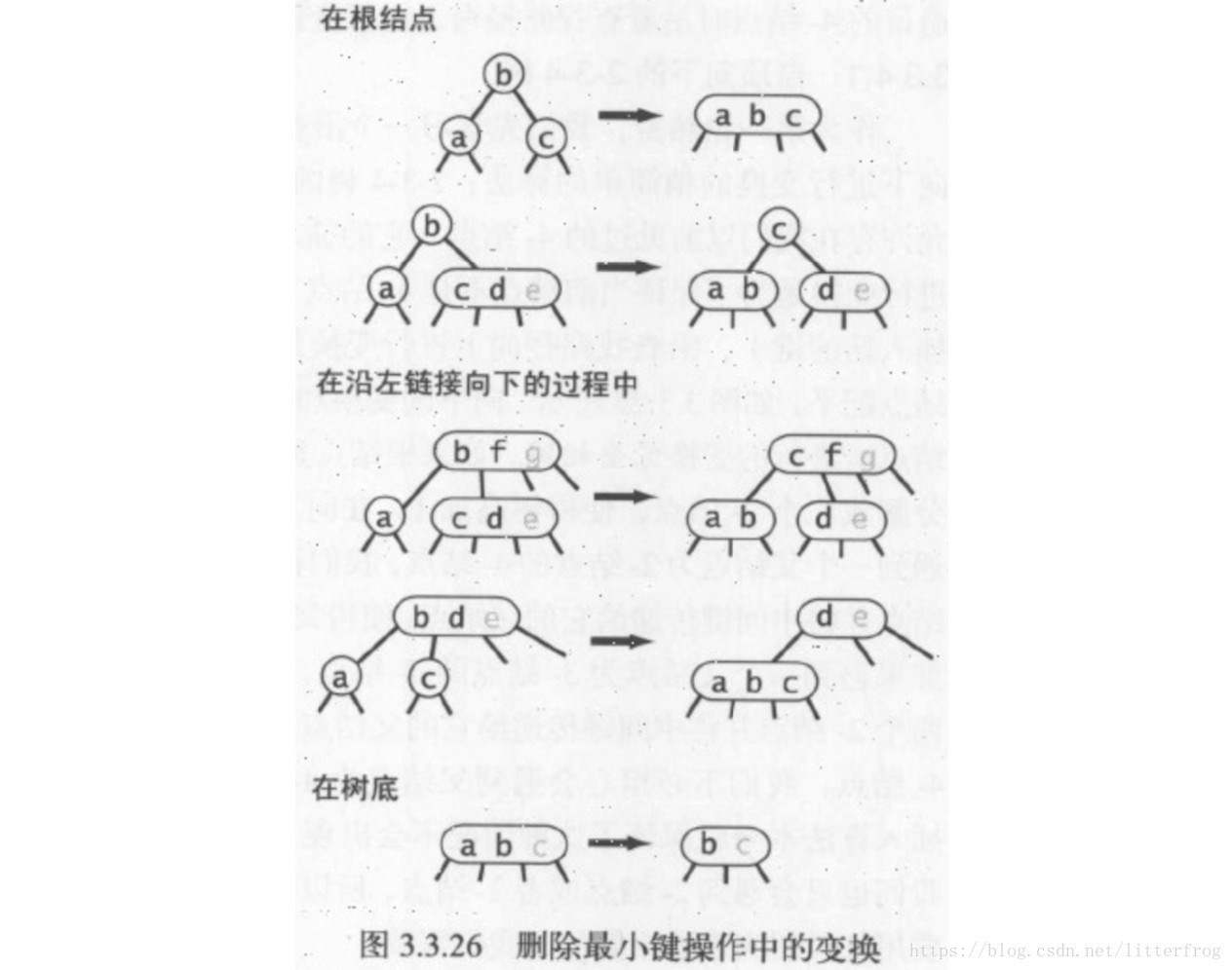 在遍历的过程中执行这个过程,最后能够得到一个含有最小键的 3- 结点或者 4- 结点,然后就可以直接从中将其删除。我们再回头向上分解所有临时的 4- 结点。