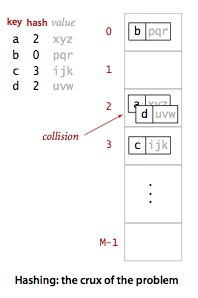 一个散列函数能够将键转化为数组索引。散列算法的第二步是碰撞处理,也就是处理两个或多个键的散列值相同的情况。一种直接的方法是将大小为 M 的数组中的每个元素指向一条链表,链表中的每个结点都存储了散列值为该元素的索引的键值对,这种方法称为拉链法。