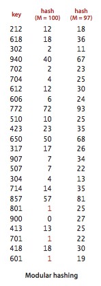 假设我们有一个应用程序,其中的键是美国的社会保险号。诸如123-45-6789之类的社会保险号是分为三个字段的9位数字。第一个字段标识地理区域发出号码的位置(例如,第一个字段为035的号码来自罗德岛,而第一个字段为214的号码来自马里兰州),其他两个字段标识个人。有十亿个不同的社会保险号,但是假设我们的应用程序只需要处理几百个密钥,那么我们就可以使用大小为M = 1000的哈希表。实现哈希函数的一种可能方法是使用三个密钥中的数字。使用右侧字段中的三位数字可能比使用左侧字段中的三位数字更可取(因为客户在地理区域上可能分布不均),但是更好的方法是使用所有九位数字一个int值,然后考虑整数的哈希函数。