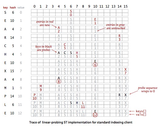 开放地址类的散列表的核心思想是与其将内存用作链表,不如将它们作为在散列表的空元素,这些空元素可以作为查找结束的标志。我们在实现中使用了并行数组,一条保存键,一条保存值。