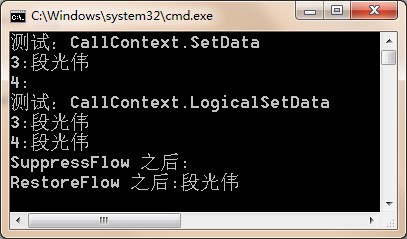 Console.WriteLine("RestoreFlow 之后:" + CallContext.LogicalGetData("test"));