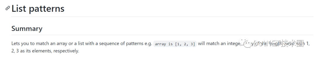 目前正在考虑在 IEnumerable 类型上添加对列表模式的支持,点此查看关于该列表模式的详细介绍。