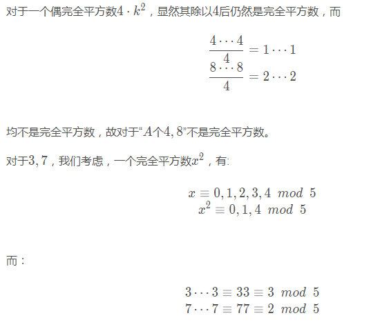 很显然,这题就是让我们判断“A个B”是不是完全平方数,我们从感觉上判断,形如 666 ⋯ 666 这样的数,一般来说都不是完全平方数,现在我们来证明一下。