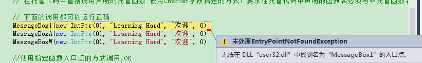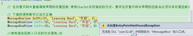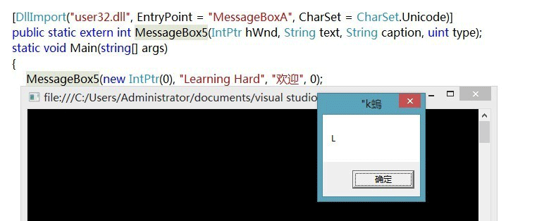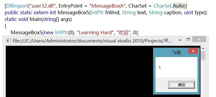 MessageBoxA(new IntPtr(0), "Learning Hard", "欢迎", 0);