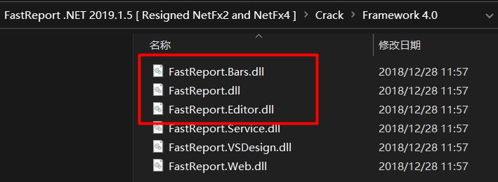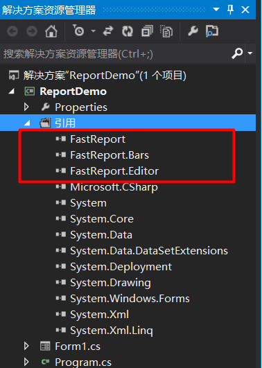 接着我们先引入FastReport的核心dll依赖,这些文件的目录在FastReport安装目录下,分别是FastReport.dll,FastReport.Editor.dll,FastReport.Bars.dll。