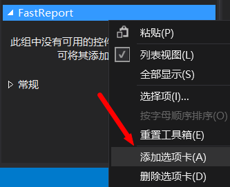 现在我们需要在ToolsBox中引入我们需要的FastReport控件,首先我们在ToolsBox中新建一个Item,命名为FastReport